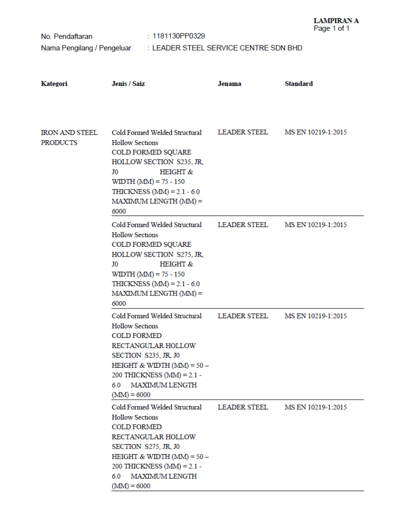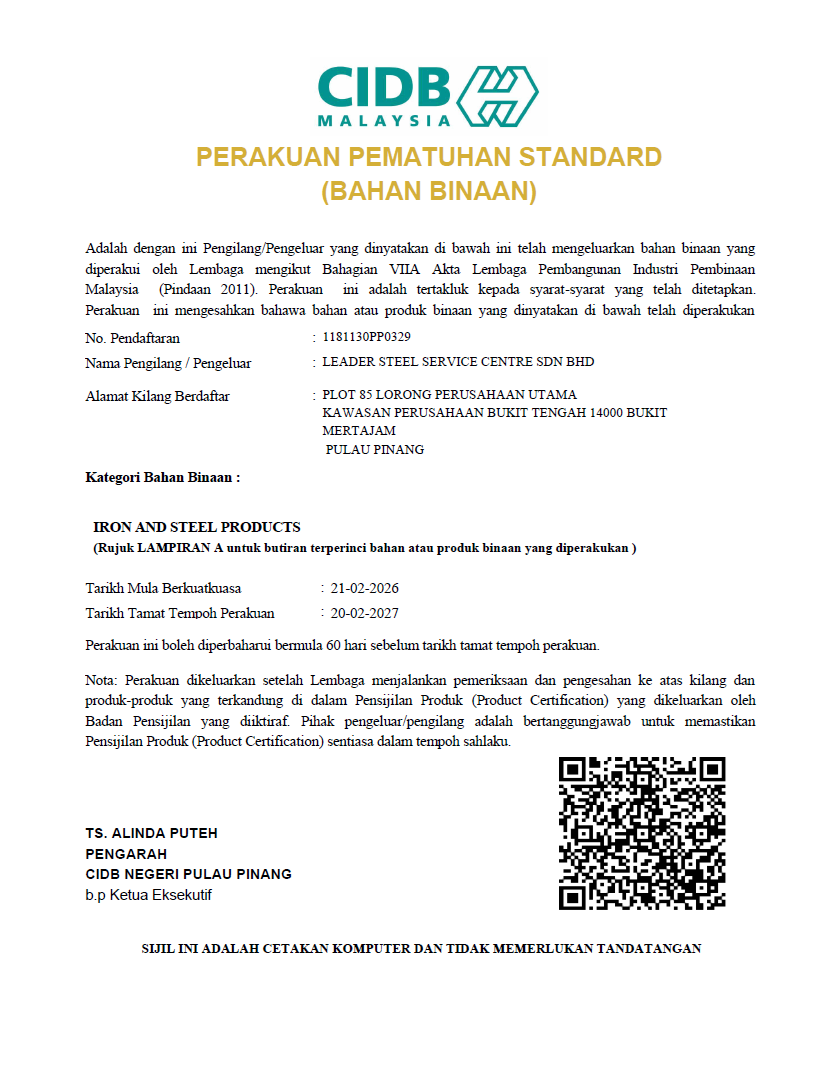 Currently Leader Steel Group operates three manufacturing facilities located at Penang, Selangor, and Sarawak. The manufacturing segment is ISO9001:2015 certified.